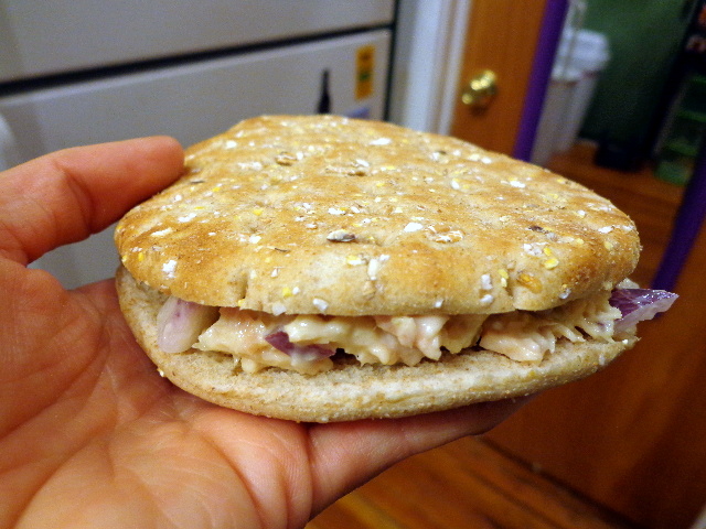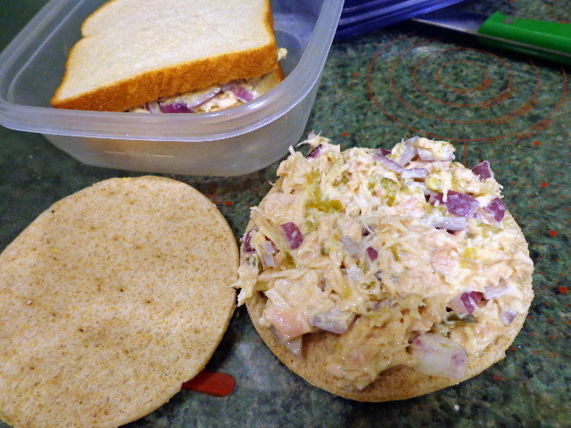 We split a can of tuna with Miracle Whip, pickle relish, and tons of red onion.