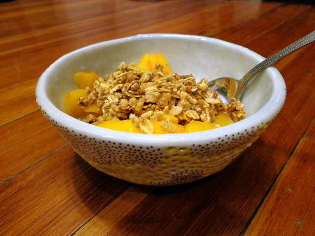 With a big bowl of (microwaved frozen) peaches topped with 1 tsp brown sugar, 1/3 cup KIND Maple Walnut Clusters with Chia & Quinoa, and a splash of skim milk.