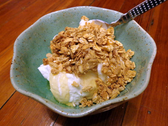 Fage 2% Plain Greek yogurt topped honey and a half serving of granola. A little more sugary than I’m hoping for every day, but the bowl was luscious and it did fill me up.