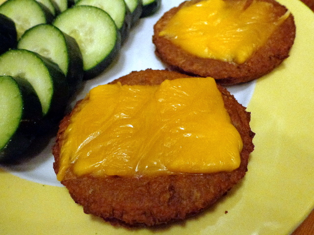 2 Quorn Cheeseburger patties* topped with some Cabot’s 50% sharp cheddar,
