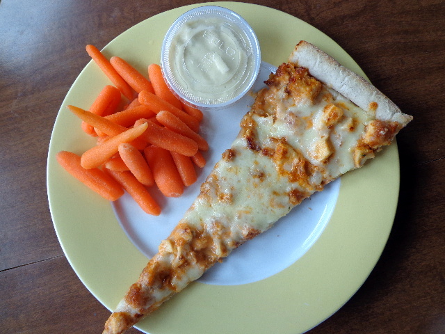 Dinner ended up being a slice of buffalo chicken pizza (that’s actually a half slice, I split with Adam) with baby carrots and blue cheese.