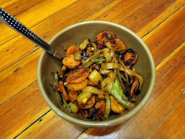 Dinner was a bit of a failure.  I sautéed frozen carrots and Wegman’s Japanese Stir Fry mix with a packet of Naysoya Shirataki Fettuccine in canola oil, then tossed in a serving of my peanut sauce and let it get nice and crispy.