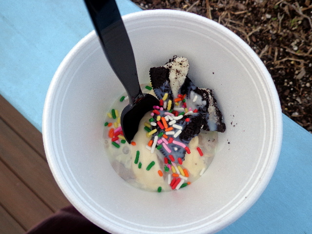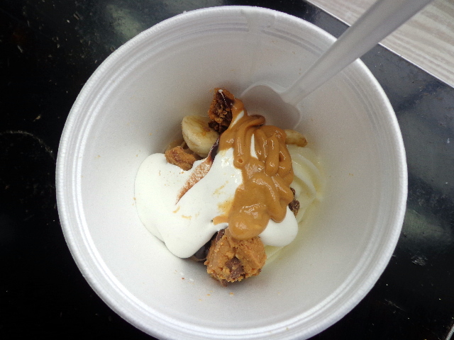 Such good topping options! I got a little bit of yogurt with marshmallow fluff, peanut butter topping, bananas, and reese’s peanut butter cups.