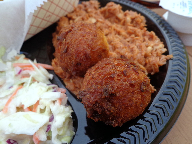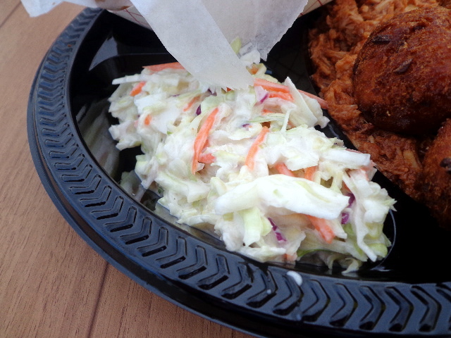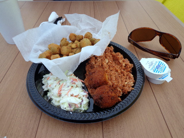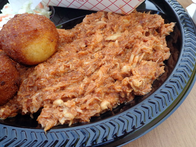 Pulled chicken platter with cole slaw, hush puppies, and fried okra.