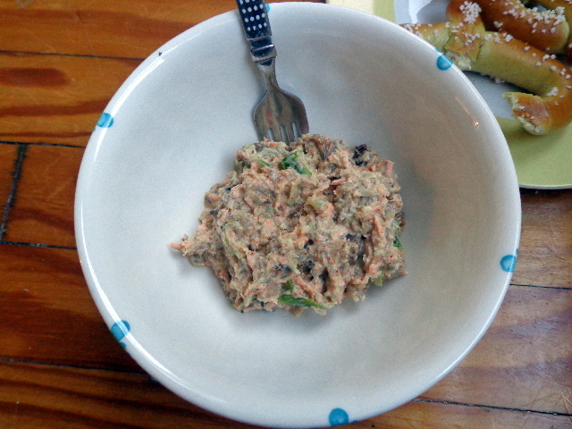 For the salad Adam and I split the can, mashed with mayo, pink salt, and green pepper and carrots shredded with the finest side of our grater.