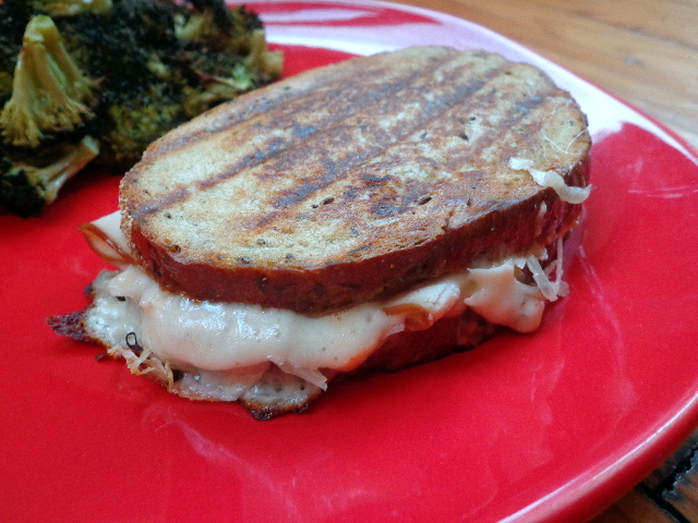 We had to use up the rest of the sauerkraut from the hot dogs and what better way to use it than on toasty turkey reubens? Wegman’s bakery rye topped with 1000 island dressing, sliced turkey, slices of provolone (Adam hates Swiss), and sauerkraut, then pressed the sandwiches in our George Foreman grill.