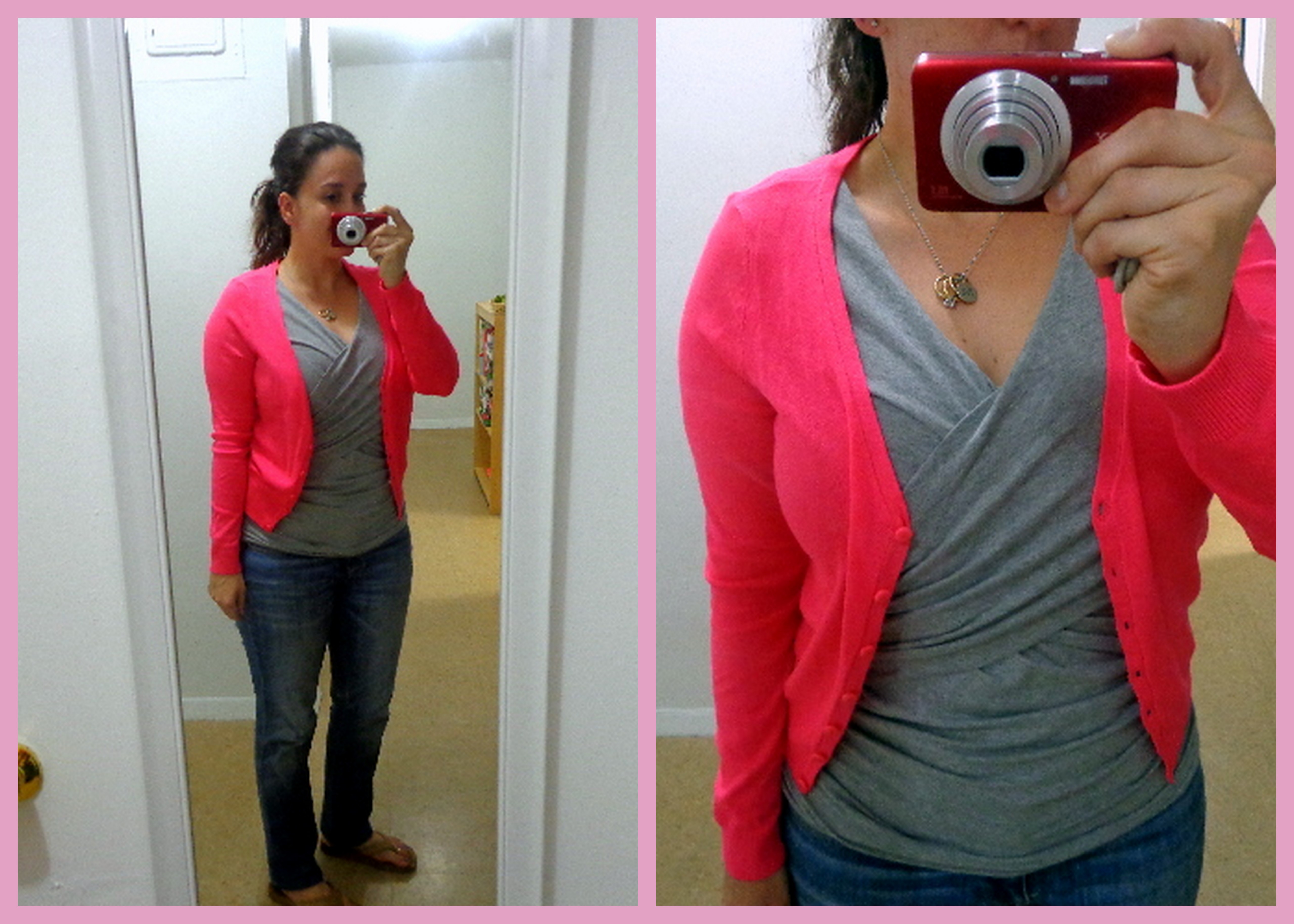 And I can’t get an accurate picture, but this cardigan was the most fabulous shade of neon pink.