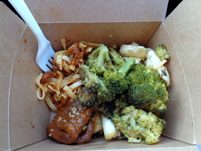 {B} The corn salad and tortellini that were hidden under the broccoli were nice, but the vegan Asian options on the left both had a strange aftertaste.