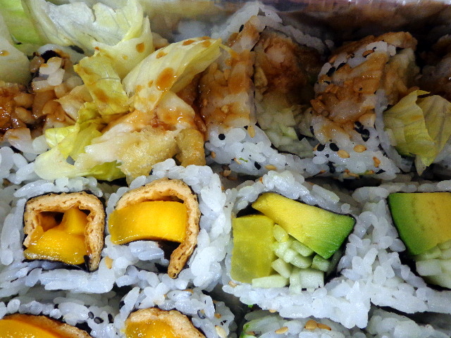 The night before my exam, I got take-out from A-Chiban. Mango-inari, fish tempura, and a veggie roll.