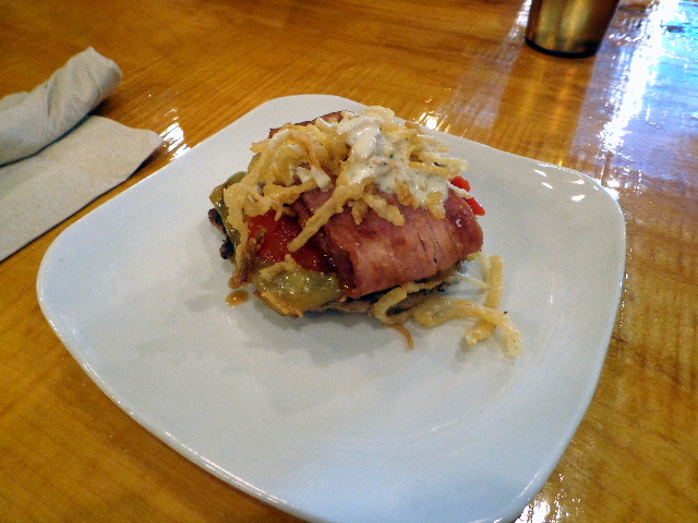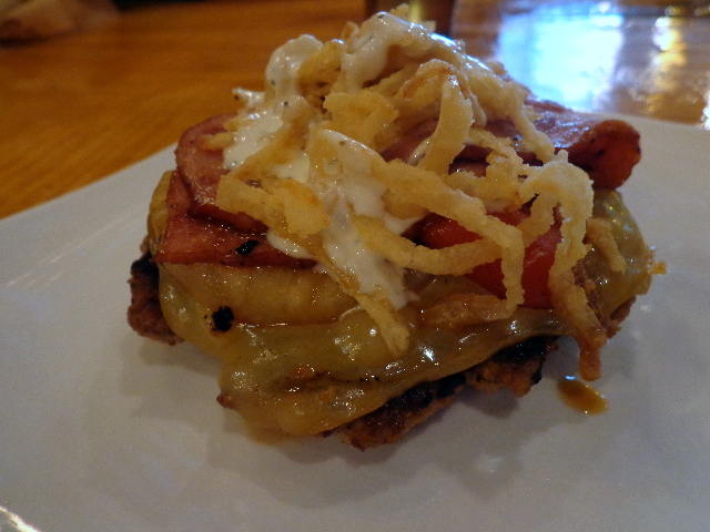 The Maui Wowie (sans bun) was far from boring; it was topped with smoked mozzarella, turkey bacon, grilled pineapple, fried onions, fire-roasted red pepper, and buttermilk ranch.