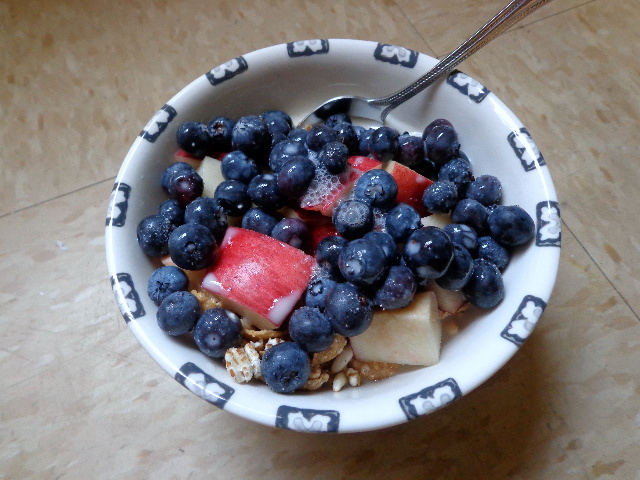 Kashi Honey Puffs and Nature’s Path Bran flakes with unsweetened vanilla almond milk, blueberries, nectarine, and a sprinkle of sugar.