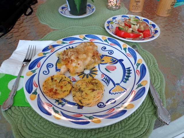 Cucumber and tomato salad, cornmeal-breaded baked summer squash,