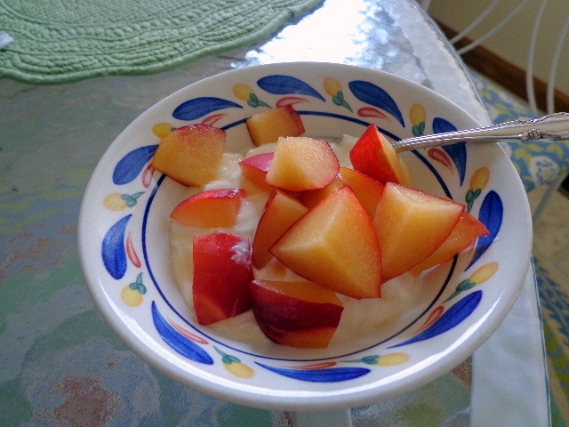 Liberté Peach and Passionfruit Non-fat Greek Yogurt topped with more fantastic red plum. Liberté makes Greek yogurt now?! My heart practically leapt out of my chest.