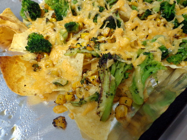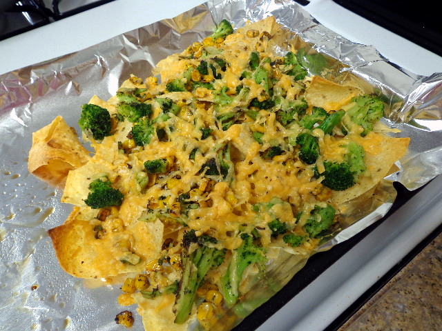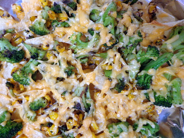 Leftover tortilla chips from a Moe’s run, baked with roasted corn, broccoli, and the last of the aged Gouda from our cheese plate.