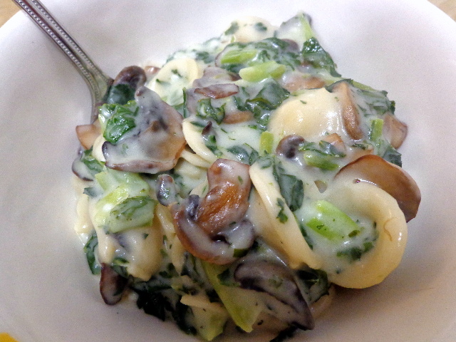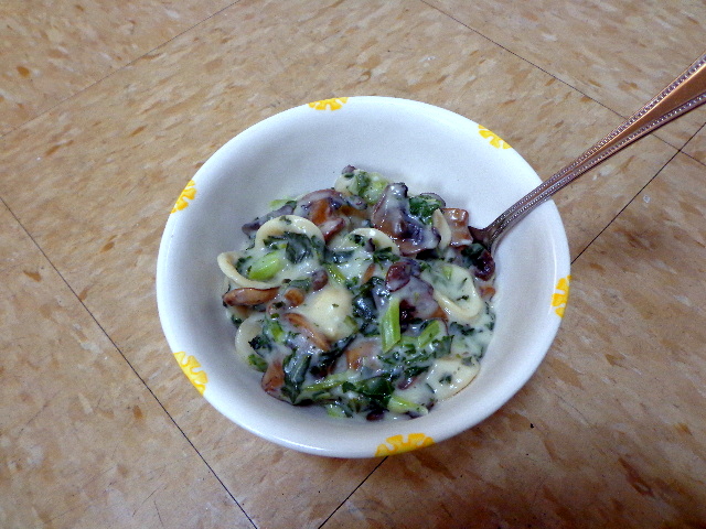 I basically re-made the sauce and pasta base of my vegan mac and cheese, but with Mozzarella Vegan Gourmet Shreds.  Then I tossed in 20 oz of browned mushrooms a blend of collard greens, kale and mustard greens (a blend bag from the frozen section at WF).  The mushrooms were the best part, as always.