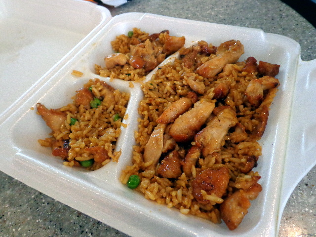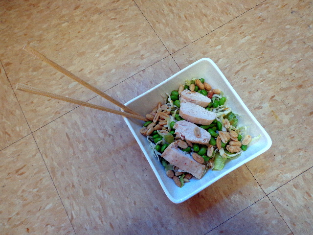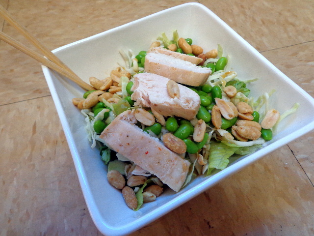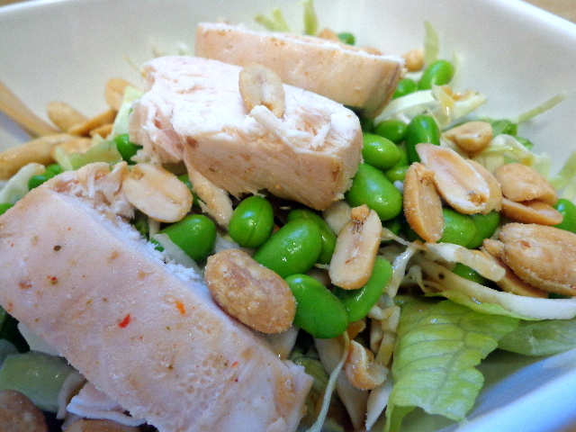 Romaine topped with sliced chicken (marinated in TJ’s spicy peanut vinaigrette, then baked), edamame, shredded cabbage, salted peanuts, and more spicy peanut vinaigrette.