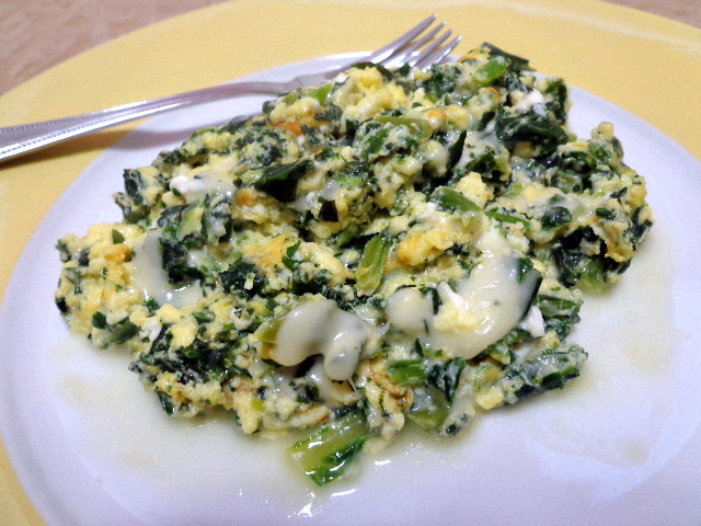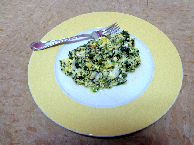 Eggs scrambled with cottage cheese, greens (a frozen blend from Whole Foods), and 2% provolone.