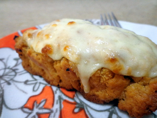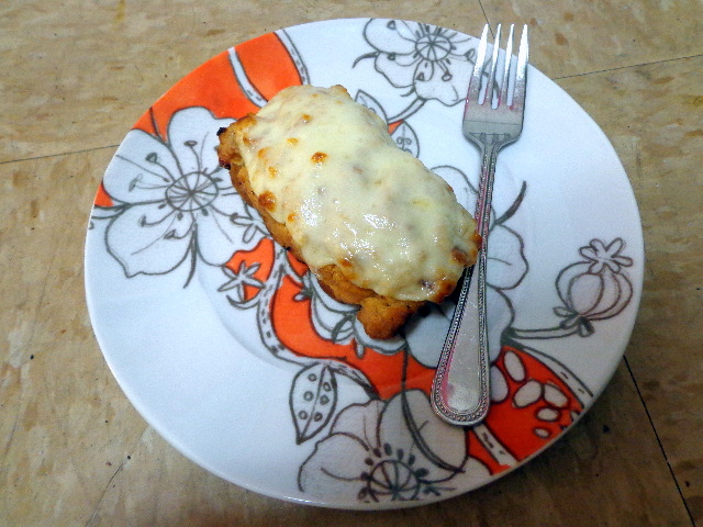 A big hunk of beer bread topped with trout salad (TJ’s canned smoked trout mashed with Miracle Whip) and 2% provolone then stuck under the broiler.