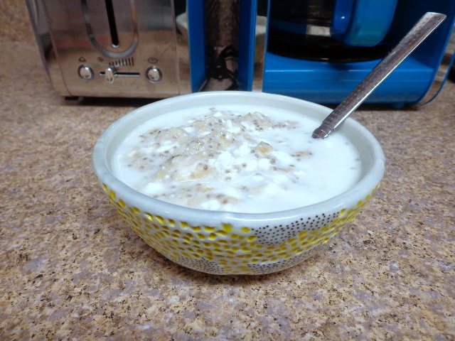 In the bowl were unsweetened almond milk, banana hunks, oats, chia seeds, tons of cottage cheese, and the very last of the sweetened condensed milk.