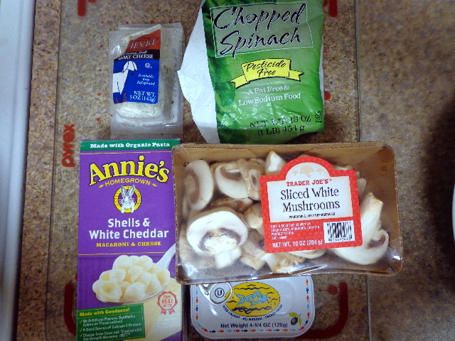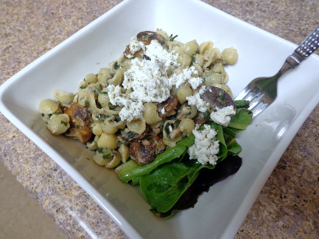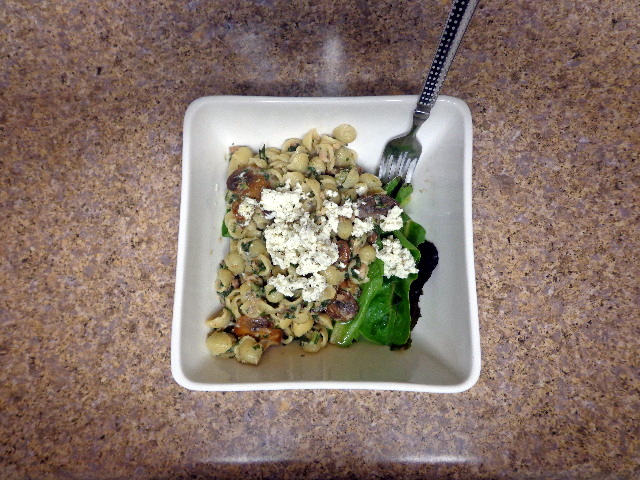 My salad was technically on the bottom, not the side. I topped my greens with mac (Annie’s Shells and White Cheddar, with spinach, mushrooms, and Bela smoked sardines) and then topped my whole bowl with crumbled goat cheese.