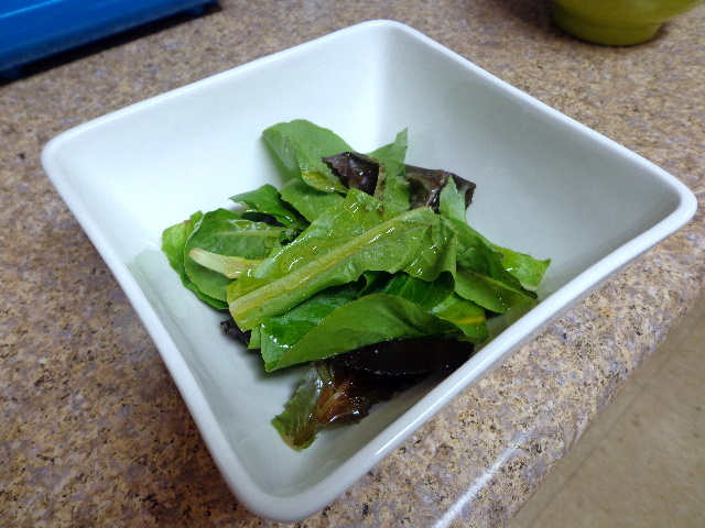 Salads on the side. A romaine blend dressed with a sprinkle of salt and 1 tsp each honey and olive oil.