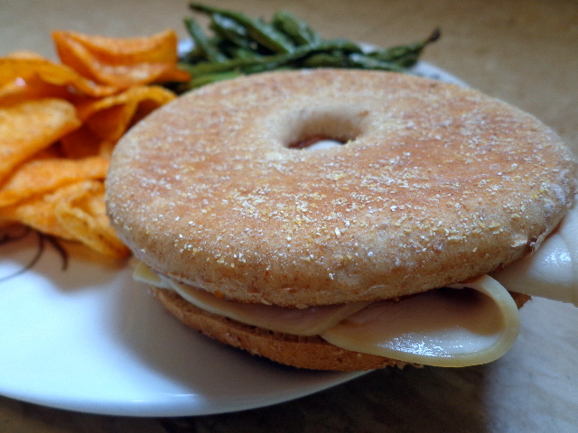 A whole wheat Bagel Thin topped with Applegate Farms roasted turkey, TJ’s pumpkin butter, and a TJ’s mini brie bite.