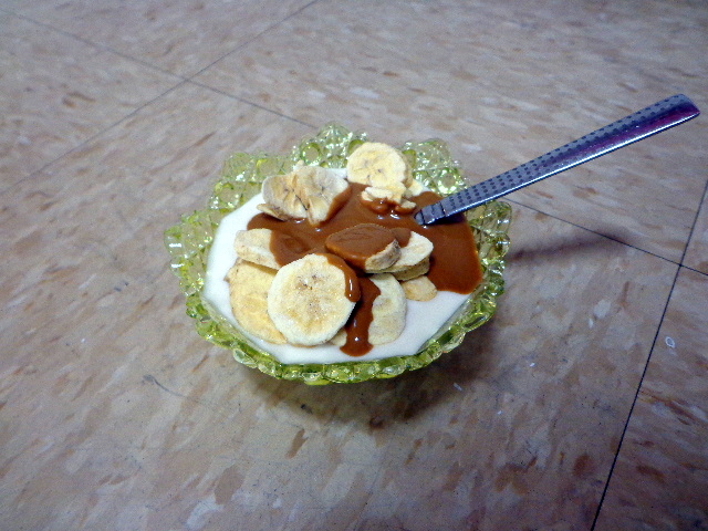 Wallaby low-fat maple yogurt topped with Crispy Green bananas (former freebie), and melted Biscoff Spread.