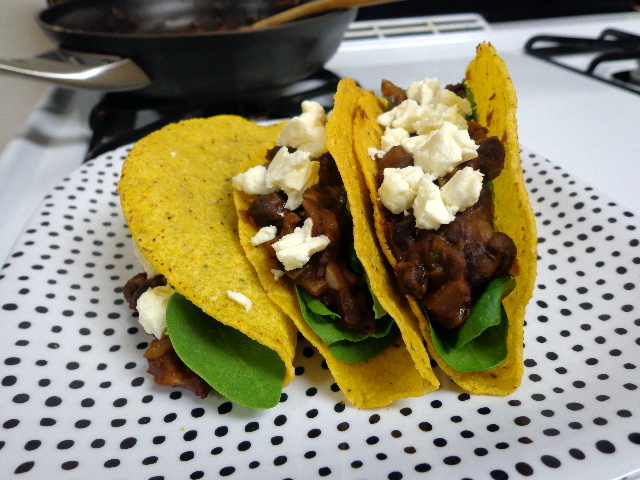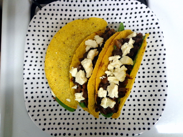 - Stuff the bottom of each taco with spinach. Spread the bean mixture evenly among the tacos on top of spinach. Top tacos evenly with feta cheese.
