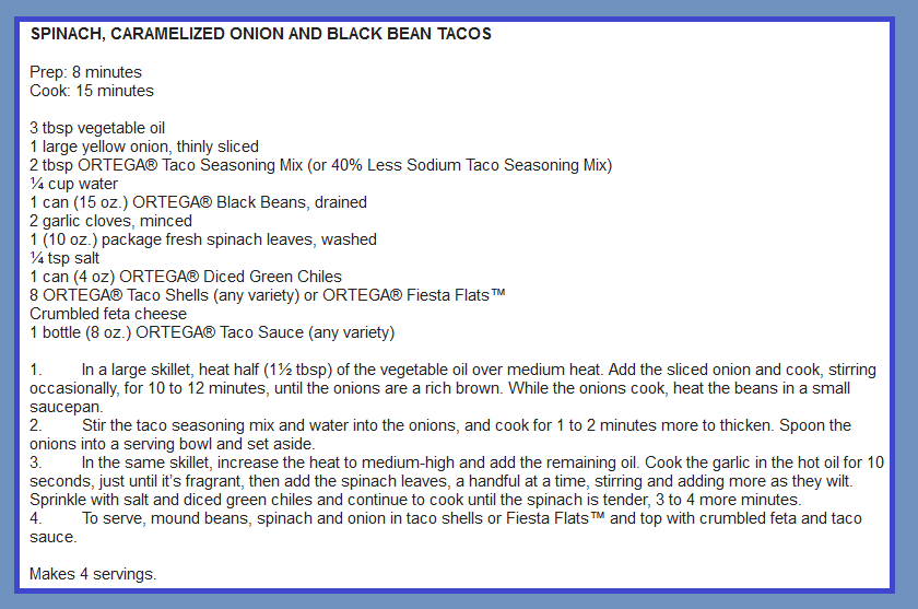 - 1 packet Ortega 40% less sodium taco seasoning mix