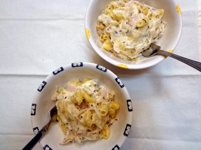 - Fold cooked macaroni, sauerkraut, toasted caraway seeds, and diced turkey into the cheese.