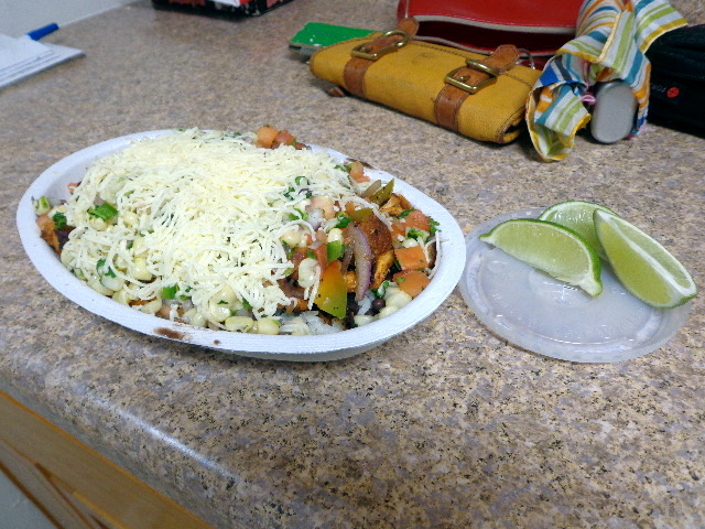 Plus my rice bowl – chicken, rice, salsa, corn, roasted veggies, and cheese – was so giant that I was able to take a 1/3 out for the next day’s lunch and still have a huge dinner.