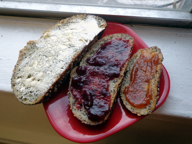 End pieces of TJ’s Three Seed and Honey Bread topped with Smart Balance Light, grape Crofters, and pumpkin butter.