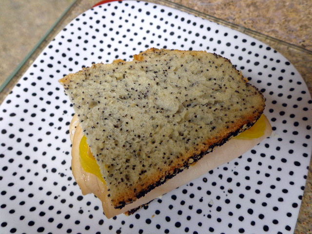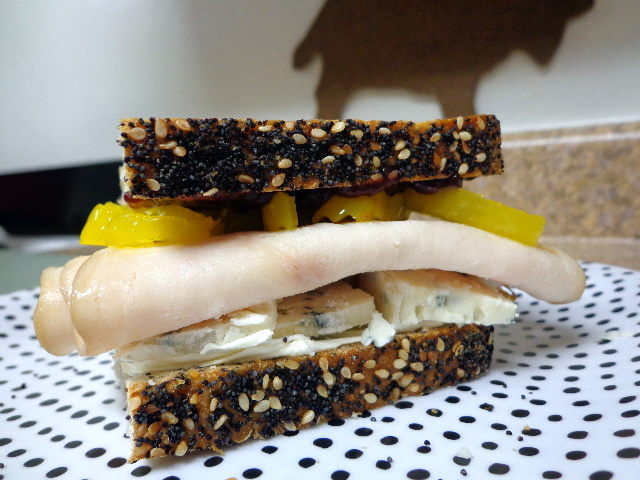 DSC05772A slice of TJ seedy bread (one cut in half since this bread is much larger than the kinds I usually eat) with Applegate Farms smoked turkey, cream cheese, blue cheese, grape Crofter’s, and banana peppers.