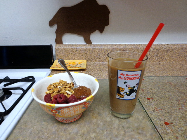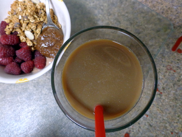 DSC05799And cold (we were out of ice) coffee with skim milk on the side.