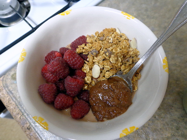 DSC05792TJ European Style Low-fat Chocolate Yogurt topped with fresh raspberries, a scoop of Cascadian Farm Dark Chocolate Almond Granola and a spoonful of cinnamon maple pecan butter.