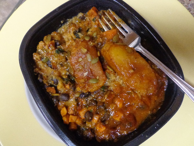 Our fridge is very bare, and I finally ate the frozen meal I bought the day we moved in, a Kashi Mayan Harvest BakePlantains, roasted sweet potato, black beans and kale with a spicy ancho sauce served over 7 Whole Grains & Sesame Pilaf, amaranth and polenta topped with a pumpkin seed garnish.