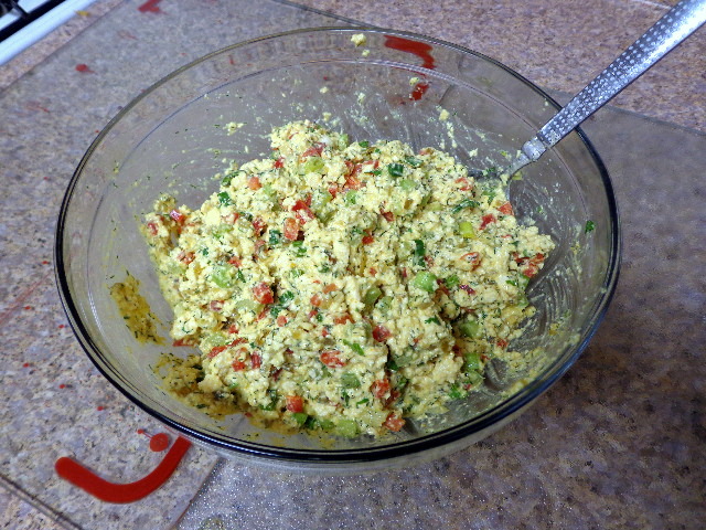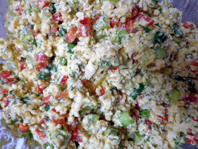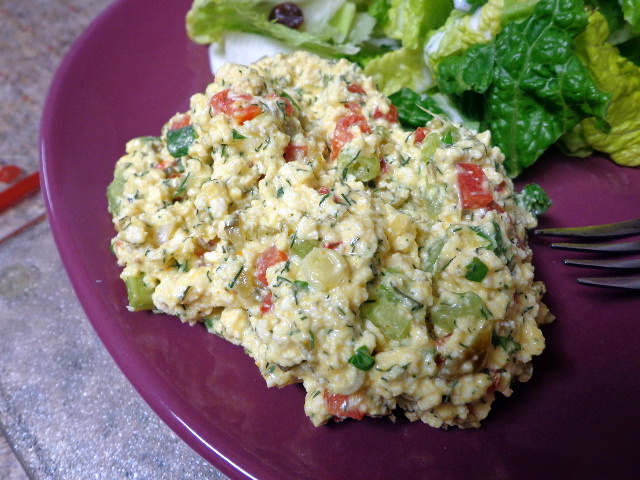 This was our favorite recipe of the bunch. It has a tofu base, but an avowed tofu hater wouldn’t know it was in there until you told them. I don’t usually put so many veggies in my egg salad (though I totally should) so I tasted this before I added in most of the produce and yep, it tasted just like egg salad!