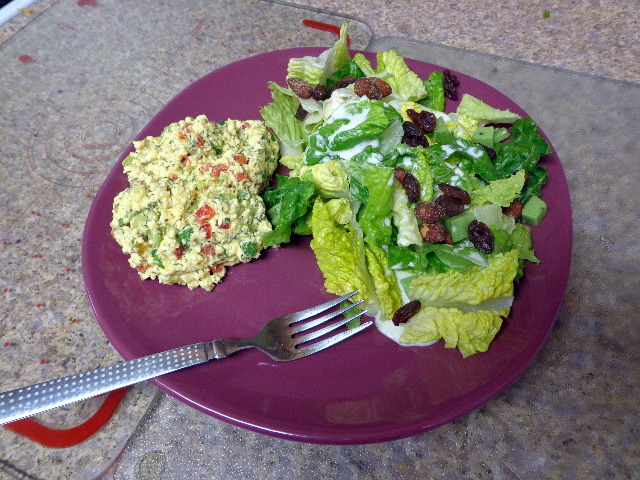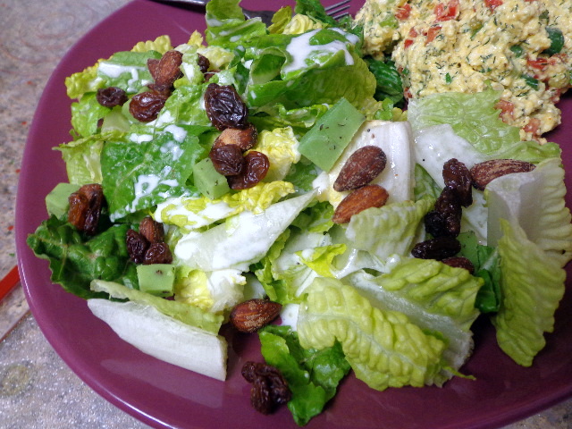 Served on a salad, obviously. With romaine, smoked almonds, raisins, and pesto gouda. I liked the tang of this a lot. And I loved that there were only about 35 calories a serving, because the husband tends to coat his salads in dressing.
