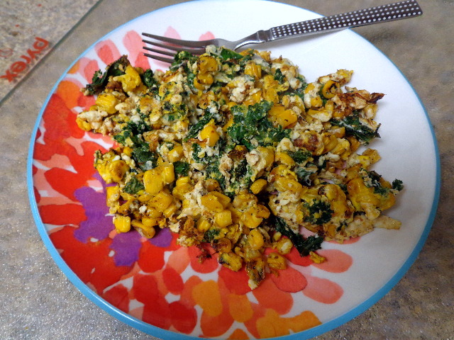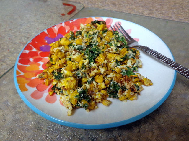 Eggs scrambled with kale and corn.