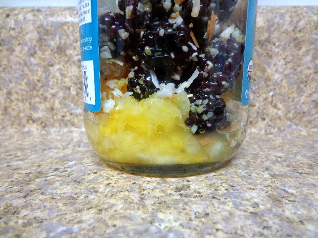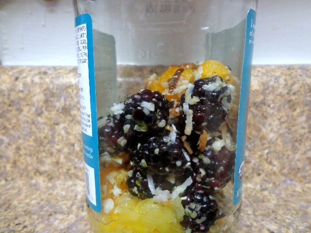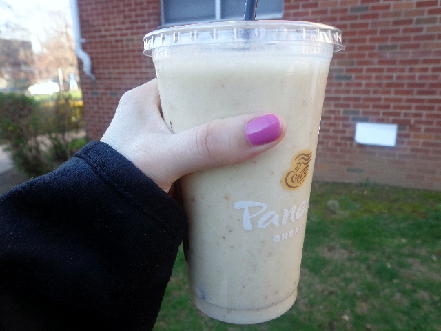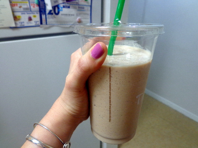 Crushed pineapple, frozen banana, toasted coconut, and vanilla almond milk. I should have added nutmeg to this because that’s what I put on my piña coladas.