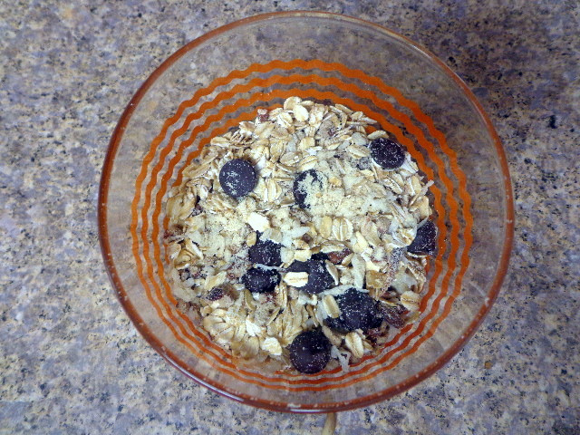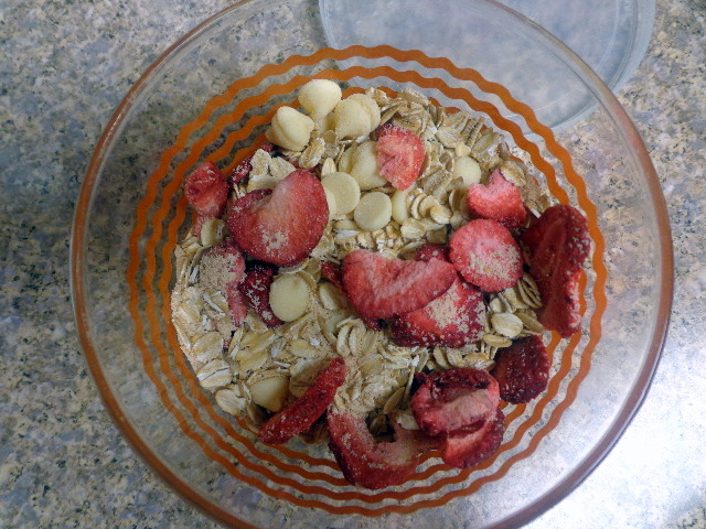 Berries and cream oatmeal = white chocolate chips and freeze-dried strawberries.