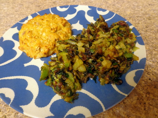 Shredded Brussels sprouts cooked with coconut oil, crushed pecans, chopped celery, and swiss/gruyere cheese.