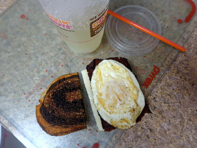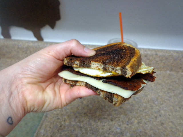 We shared a sandwich of fried egg, fontina cheese, mustard, and the rest of the Sweet Earth vegan bacon on pumpernickel rye swirl. Homemade egg sandwiches are always wonderful, but the sweet and smoky flavor of the “bacon” took this one to a new level.