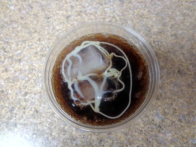 Put ice and prepared strawberries in the bottom of your cup. Pour desired soda on top – you don’t have to use Diet Coke, I guess. Drink with a straw.