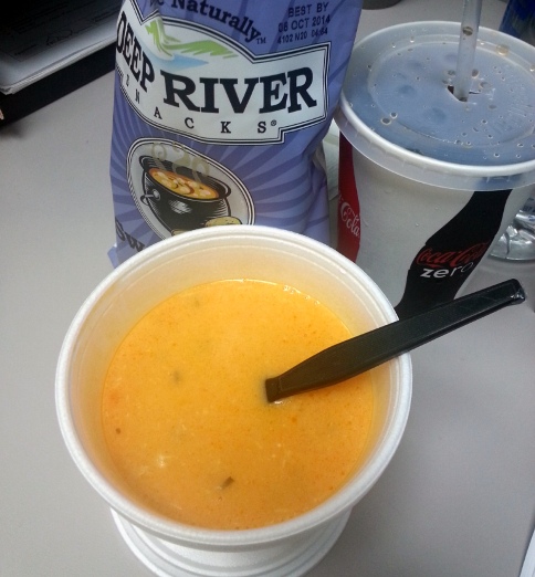 Sweet onion kettle chips and a cup of buffalo blue cheese soup from the cafeteria.