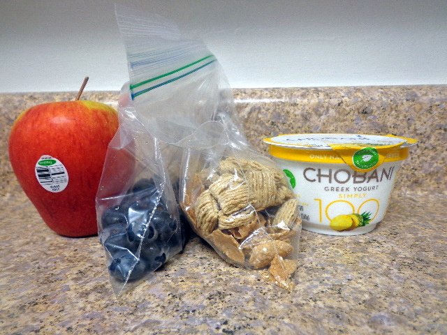 Yogurt lunch. I stirred together fresh blueberries, a mix of Nature’s Path Heritage Flakes and Quaker Brown Sugar Oatmeal Squares, and a pineapple Chobani. Plus an apple on the side.