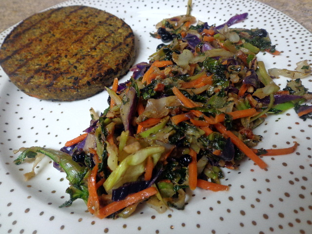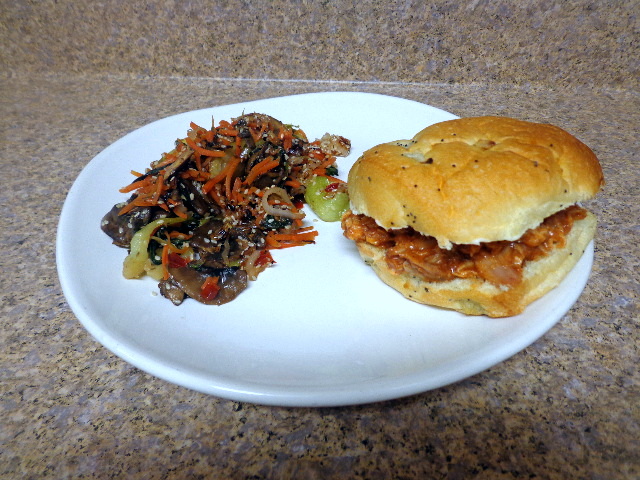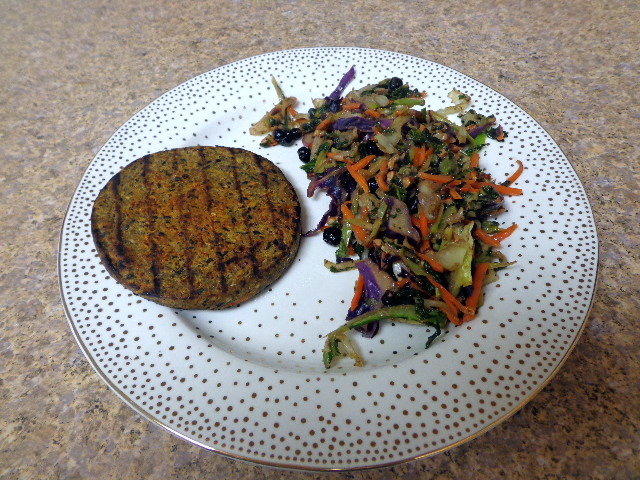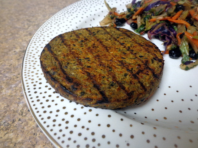 The burgers were nowhere near as good as the terrific bacon, but they weren’t bad. Sadly the flavor was fairly “Bland, now with spices.” But I liked the textural aspect of the flax seeds. And they cooked up very quickly, making them an easy 230 calorie, 6 grams of fiber, 18 grams of protein vegan option. I went back and topped mine with mustard.