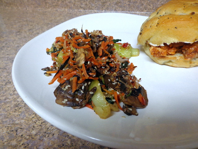 The veggie component was baby bok choy, mushrooms, and shredded carrot, cooked with evoo, fish sauce, rice vinegar, and hot pepper jam, with sesame seeds and fried shallots tossed in at the end.