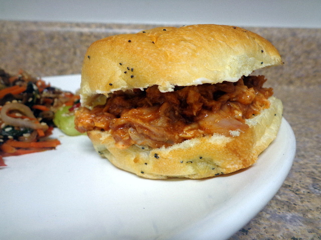 We doused some chopped roasted chicken in our sauce, then served it on onion buns with a schmear of Miracle Whip.