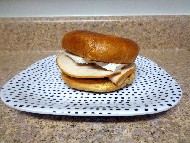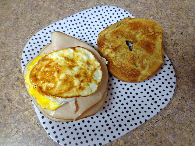 French toast bagel topped with 2 slices of Applegate Farms smoked turkey, an egg, and 1 oz of Brie.